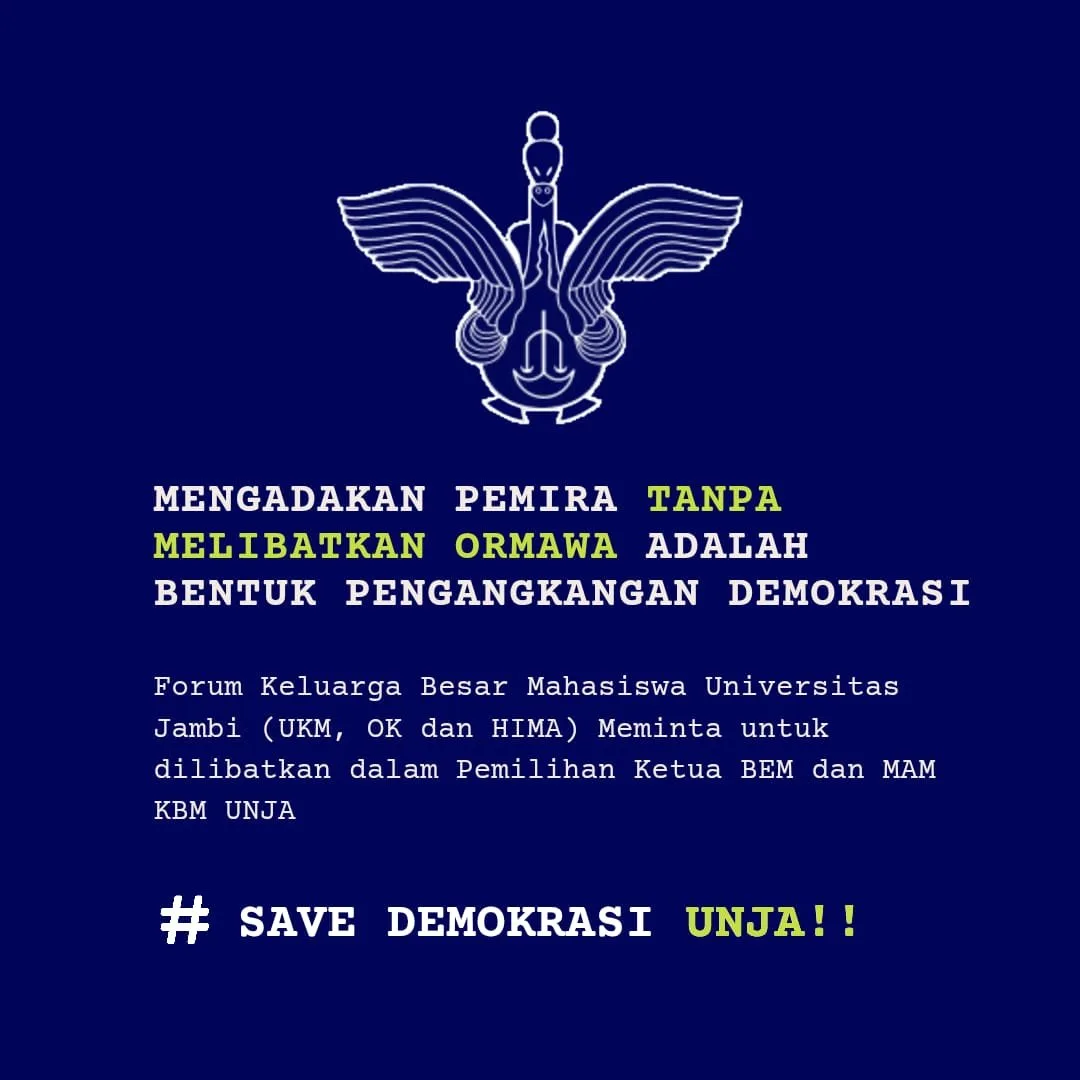 Dengan bergantinya birokrat di Universitas Jambi, semoga kisah kelam perjalanan demokrasi tiga tahun ke belakang dapat menjadi pembelajaran. Jangan mematikan gerakan politik mahasiswa di kampus demi tujuan tertentu dan melindungi kepentingan yang lainnya. Satu tahun kepemimpinan Rektor dan WR 3 (Prof. Dr. Helmi, S.H., M.H., dan Dr. Fauzi Syam, S.H., M.H.) masih menyisakan PR besar untuk mewujudkan demokrasi di Universitas Jambi. Karena organisasi seperti BEM dan MAM secara legal diakui keberadaannya dengan SK Peraturan Rektor Universitas Jambi Nomor 04 Tahun 2018. Adapun hal tersebut juga didukung oleh negara dengan terbitnya Keputusan Mendikbud Nomor 155 Tahun 1998 tentang Pedoman Umum Organisasi Mahasiswa di Perguruan Tinggi. Jika melihat kembali UUD KBM UNJA Tahun 2021, pada Bab VI Pasal 12 dijelaskan, pelaksanaan Pemilu dilakukan secara serentak dan menyeluruh di semua tingkatan, baik universitas maupun fakultas, terkecuali FKIK.