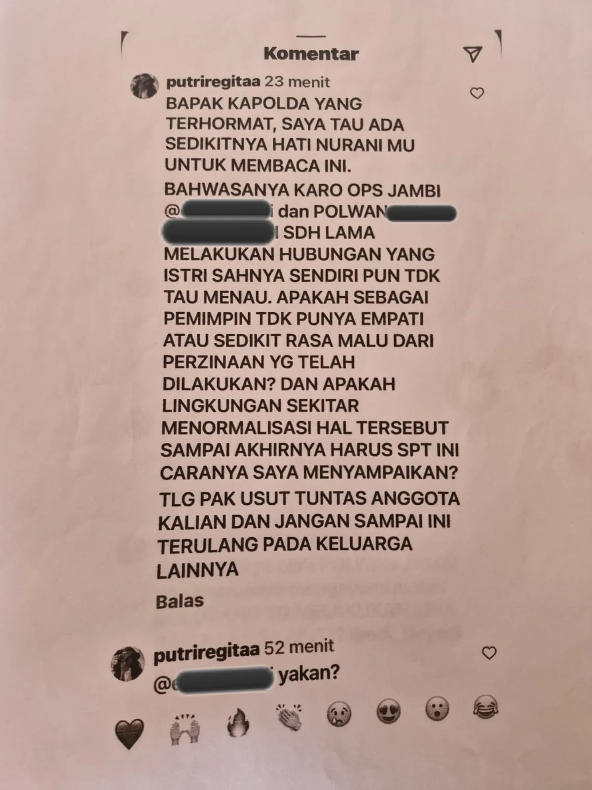 Salah satu komentar berasal dari akun @putriregitaa, yang menyinggung dugaan hubungan terlarang antara oknum perwira menengah Pejabat Utama Polda Jambi dan seorang polwan yang bertugas di Ditlantas Polda Jambi.