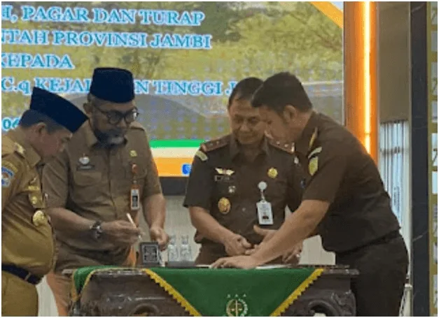 Jambi – Kepala Kejaksaan Tinggi (Kajati) Jambi Elan Suherlan menerima hibah Barang Milik Daerah (BMD) berupa tanah, pagar dan turap yang terletak di Kelurahan Arab Melayu Kecamatan Pelayangan Kota Jambi yang sebelumnya milik Pemerintah Provinsi Jambi, pada hari Senin, 6 Maret 2023 sekira pukul 14.00 WIB bertempat di Aula Jaksa Agung R. Soeprapto.