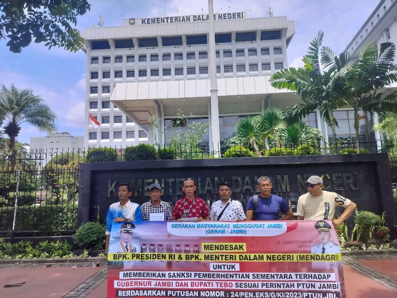 Jakarta – Gerakan Rakyat Menggugat (GERAM) Jambi menggelar aksi unjuk rasa di Kementerian Dalam Negeri (Kemendagri) menuntut pemeriksaan terhadap Gubernur Jambi dan Bupati Tebo atas dugaan pelanggaran administrasi pemerintahan terkait tidak dilaksanakannya putusan sengketa informasi publik, Jumat 21 November 2025.