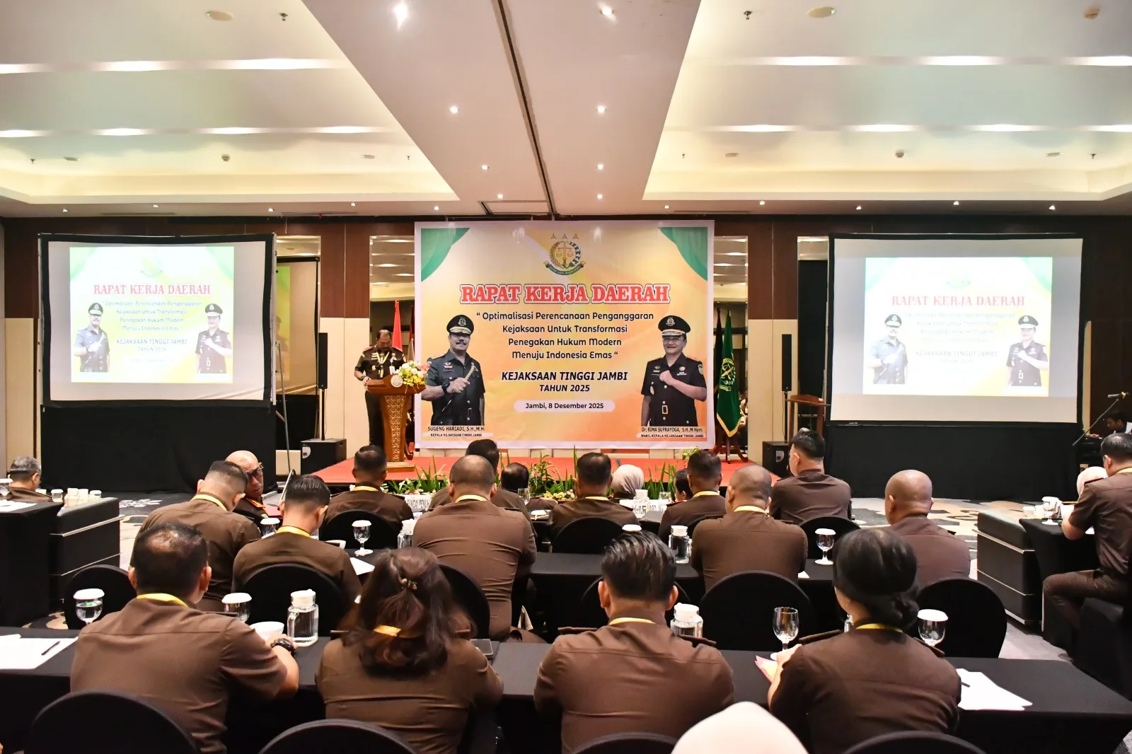 Jambi – Kepala Kejaksaan Tinggi Jambi, Sugeng Hariadi Agus Sahat ST, SH, MH, secara resmi membuka Rapat Kerja Daerah (Rakerda) Kejaksaan Tinggi Jambi Tahun 2025 yang digelar di Aston Hotel Jambi, Senin (8/12/2025).
