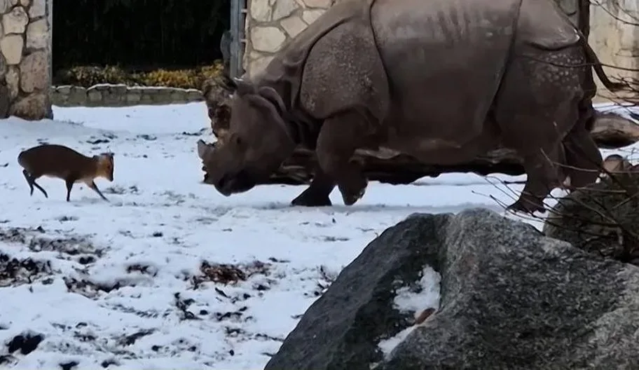 Seekor rusa muntjac atau yang dikenal sebagai rusa China terekam kamera saat beradu dengan seekor badak India di sebuah kebun binatang di Kota Wrocław, Polandia. Aksi tak biasa tersebut menarik perhatian karena perbedaan ukuran kedua satwa yang sangat mencolok.