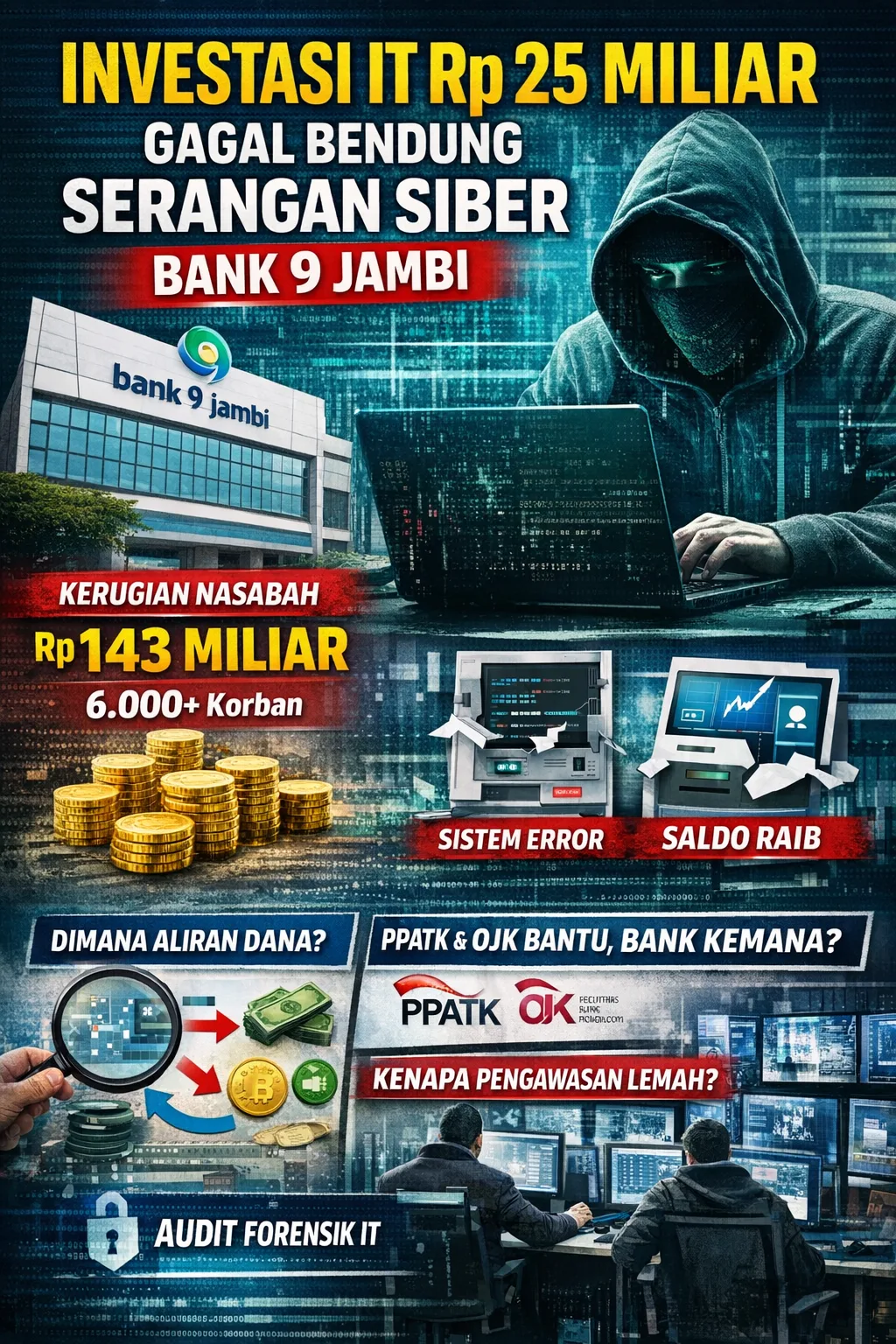 JAMBI — Kasus gangguan sistem dan dugaan serangan siber yang menimpa Bank 9 Jambi pada Februari 2026 terus menuai sorotan. Selain besarnya kerugian yang dialami nasabah, publik kini mempertanyakan efektivitas investasi teknologi informasi (IT) serta peran pengawasan internal bank dalam merespons aliran dana yang diduga hasil kejahatan.