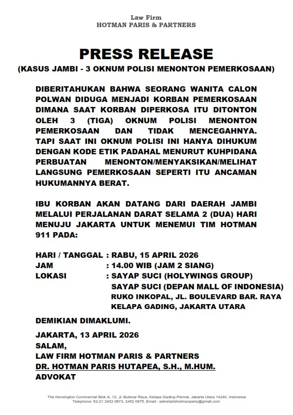 Senin 13 April 2026, Melalui rilis pers resmi Law Firm Hotman Paris & Partners, tim hukum Hotman 911 menyatakan siap turun gunung mengambil alih pengawalan kasus ini. Intervensi ini sekaligus menjadi tamparan telak bagi proses penegakan hukum di Jambi yang dinilai mencoba melindungi oknum cacat moral di balik sanksi disiplin ringan.